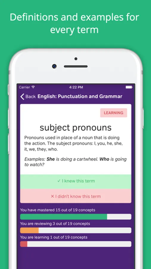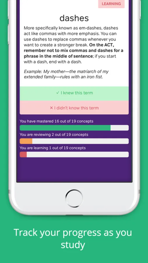 Magoosh’s ACT Flashcard App uses a spaced repetition system, because academic research shows that memories are formed by repeated exposure to new information. When using the app, you’ll notice that the concepts you are still learning will reappear frequently, and terms you already know will appear less often. This saves time and allows you to focus on the most challenging concepts.