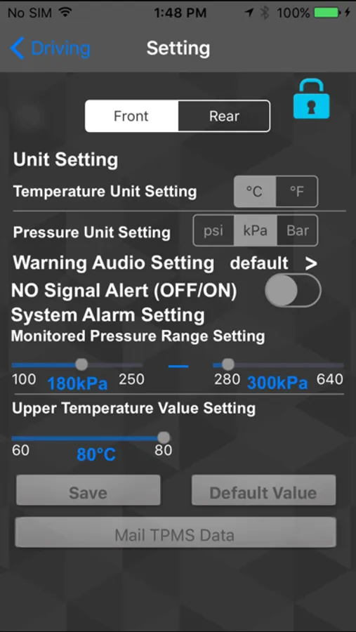 BLE TPMS (Bluetooth Low Energy Tire Pressure Monitoring System) App provides driver to get the real-time tire pressure data, temperature data and status through iPhone. It will detect the abnormal status and use voice/audio to alert driver and show the abnormal data and tire location on BLE TPMS APP.