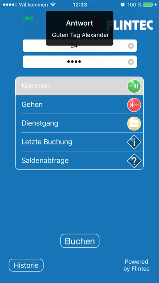 • Standard Buchungsfunktionen: kommen/gehen, Dienstgang, letzte Buchung, Saldenabfrage