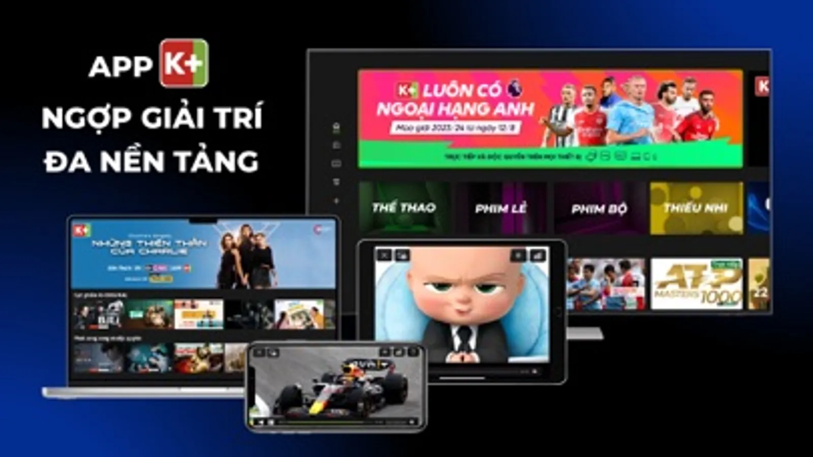 K+ is an entertainment streaming application that includes attractive live football TV channels, top sports rights, day and daet HD films, cartoons for the whole family on all platforms: SmartTV, mobile, tablet, website.