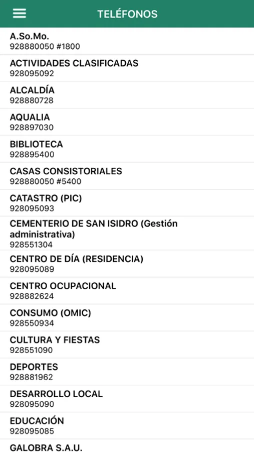 - Acceder a un amplio listado telefónico con números de teléfono de interés para los ciudadanos de Gáldar.