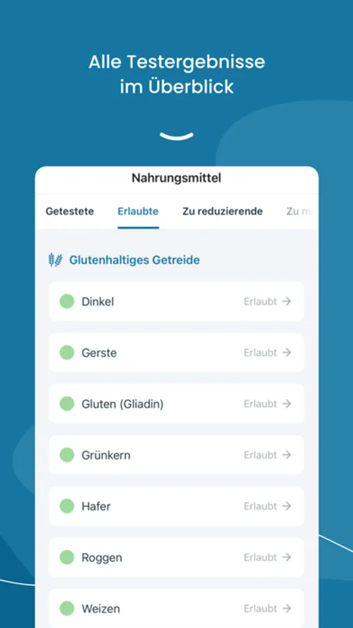 + Auflistung aller im FOODSensor testbaren Nahrungsmittel mit Darstellung Ihres persönlichen Testergebnisses für das jeweilige Lebensmittel.