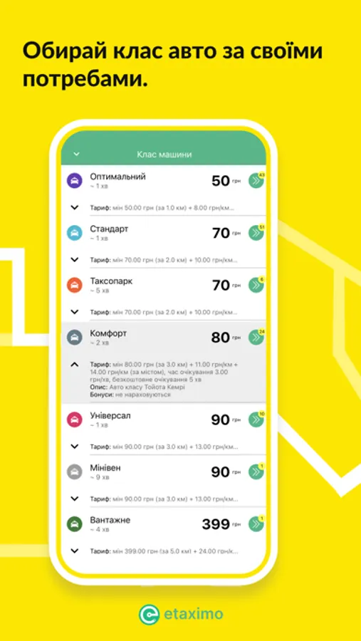 Using Etaximo app you don't just request any driver blindly, but you make a conscious choice among available drivers around you. You have got the following driver features to choose by: