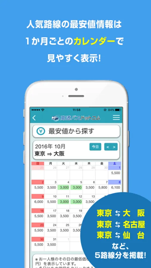 ・高速バスの最安値情報を月ごとのカレンダー表示で確認できます。