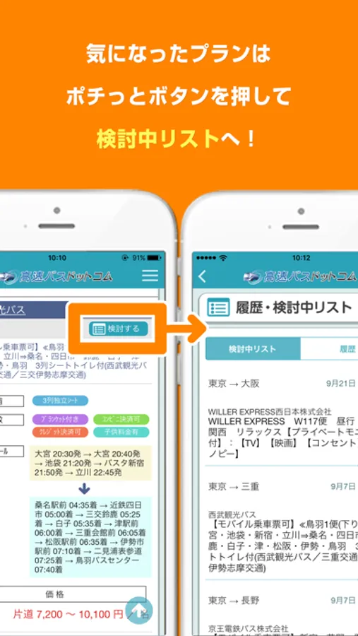 ・検索した高速バスの履歴や、検討中の高速バスをチェックできます。