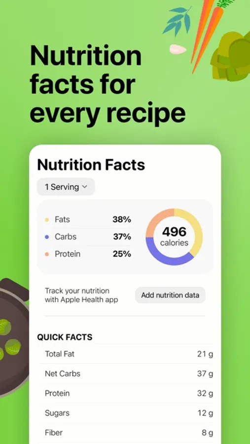 6. Track Nutrition Goals: Each recipe provides comprehensive nutrition information. Integrated with the Health app, all your health information is easily accessible in one place!