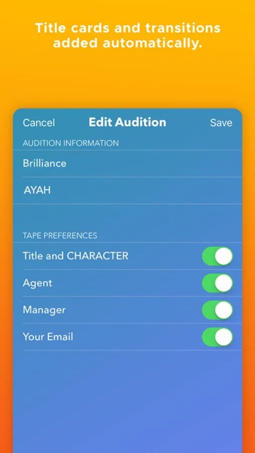 From fade-in to fade-out Slatable automates professional title cards and smooth transitions between each take, just like you'd get from a self tape studio, so you can relax and concentrate on your performance. And with our patent-pending process setting everything up is fast and easy so you can get right to your audition.