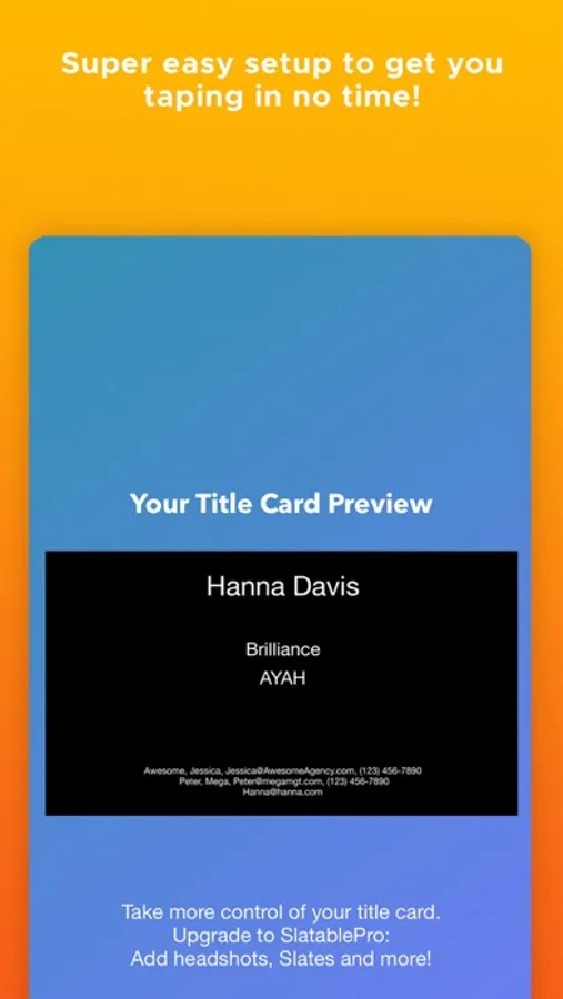 SlatablePro is packed full of features casting directors and actors have asked us for. Take control of your title cards. Add headshots, full-body slates, and more to your Auditions. SlatablePro is all you need to stand out and get seen when you submit your self tape audition.