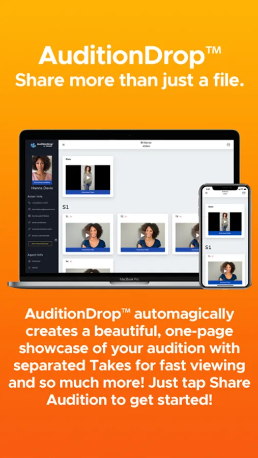 Now you can share your self tape directly from Slatable. AuditionDrop shares your audition as a beautiful one-page presentation with your contact information and separated Takes for fast reviewing and downloading.