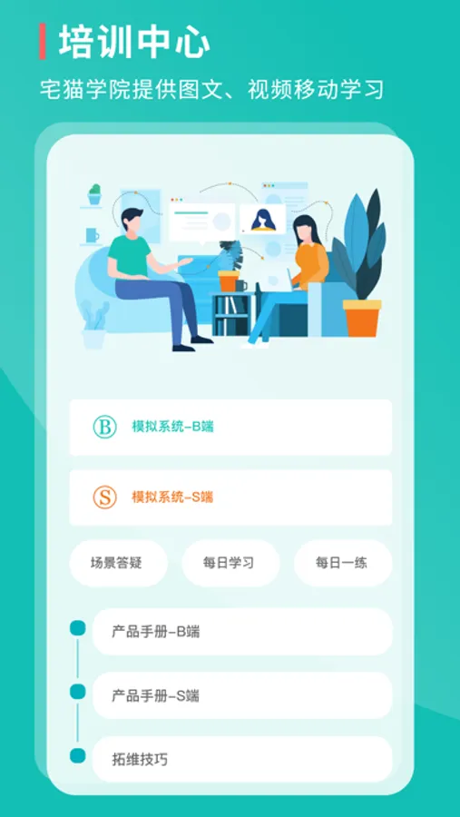 4、培训中心:宅猫学院提供图文、视频移动学习材料,让业务人员对产品使用轻松上手。同时,提供软件模拟系统帮助员工熟悉软件的操作流程,以及签约业务流程、社区拓展维护技巧、房产知识、公司制度等多维度学习方案。