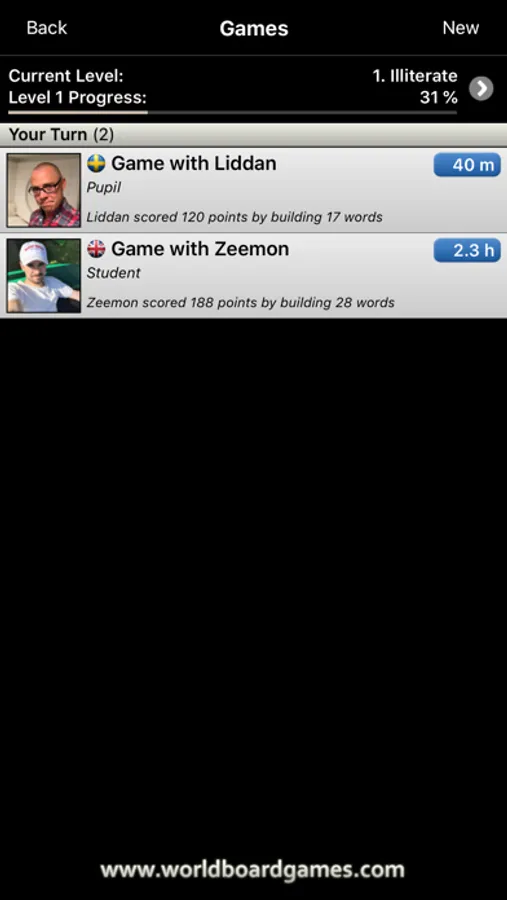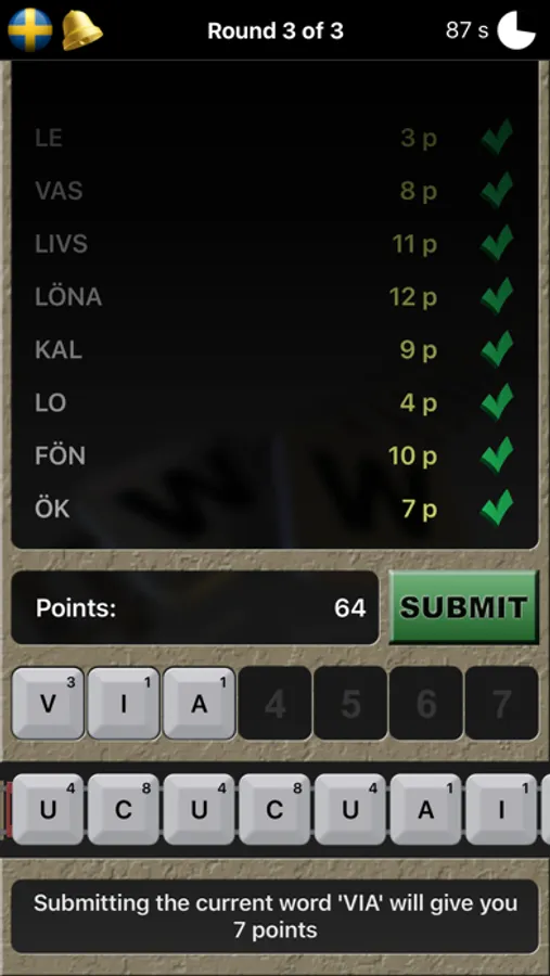 You play 3 rounds (2 minutes each) where you build and submit as many words as possible using pawns from a letter train.