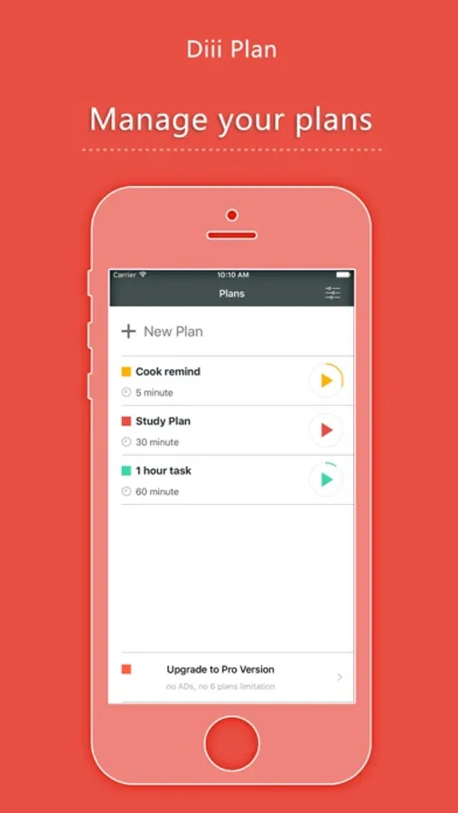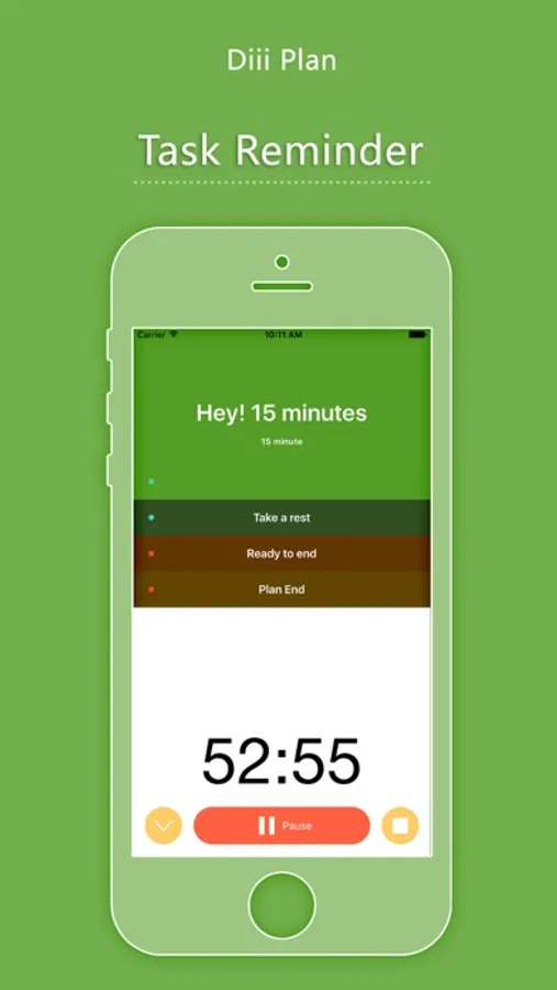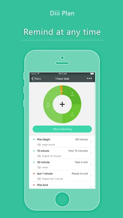 Diii Plan helps you manage your countdown plans, you can add reminds at a specified time, such as 5 minute or last 5 minutes, you will get a human voice time report at the time.