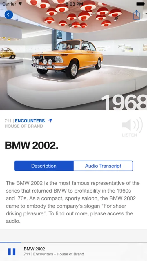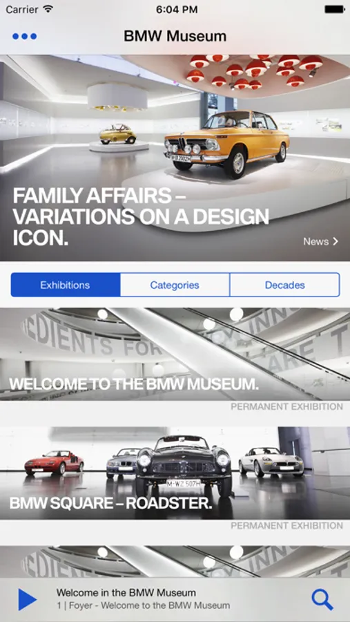 The BMW Museum app allows users to experience selected aspects, themes and eras from the brand’s history in all their detail. And they can use the app to guide them through the Museum’s individual houses in whatever order they prefer. The explanations for each exhibit take the form of recordings on the user’s device, mimicking an audio guide. Plus, the streamed content can also be displayed in written form, interspersed with pictures of the exhibit, on the user’s device. An interactive map display helps users navigate their way around the various areas more effectively.