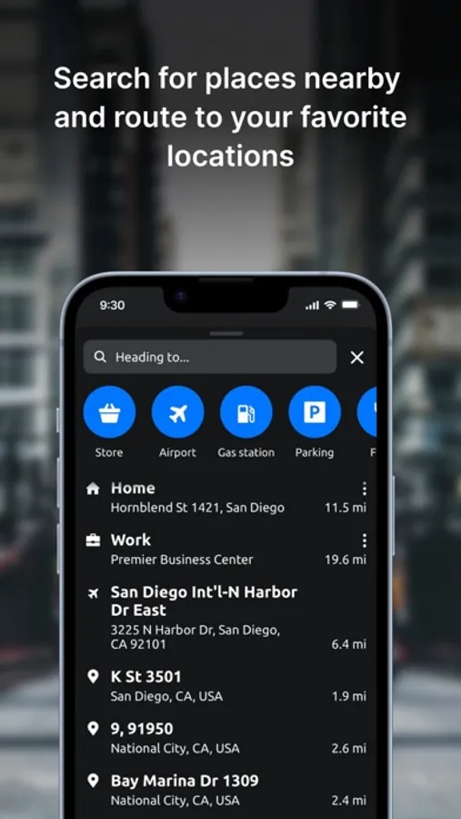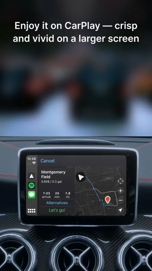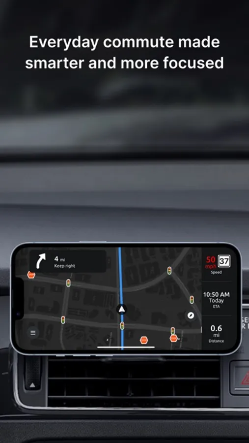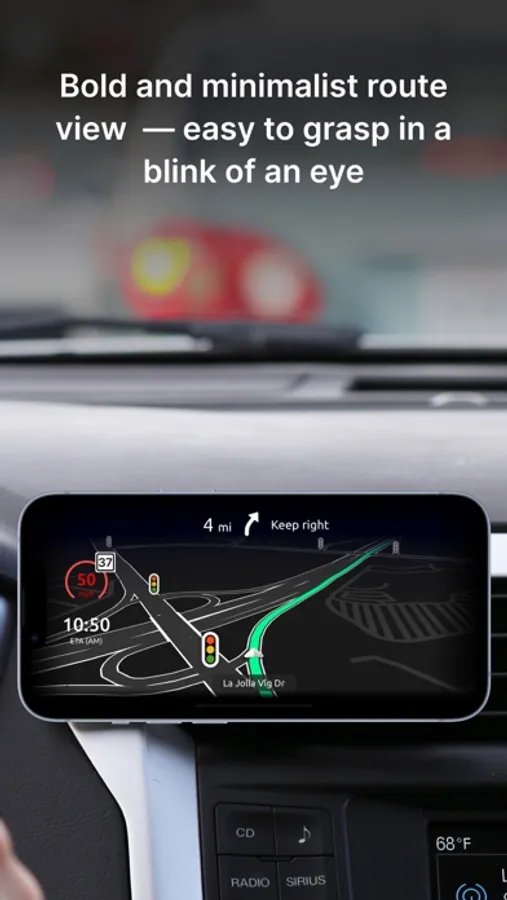 Create a route and place your smartphone on the dashboard — you’ll see the route reflected on your windshield. Keep your eyes on the road and know in advance what’s ahead — a straight run, or a ramp-turn. This is especially handy when driving between cities.