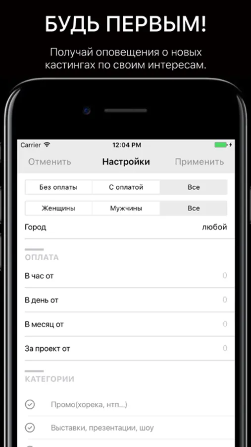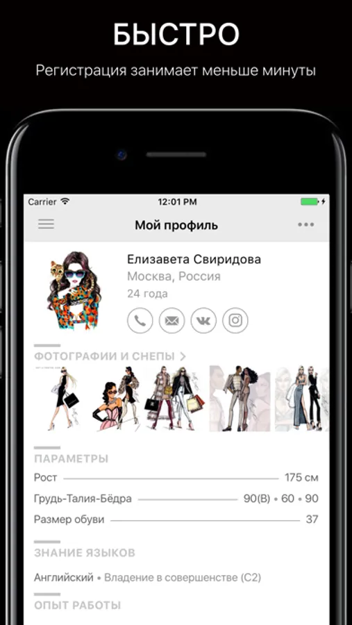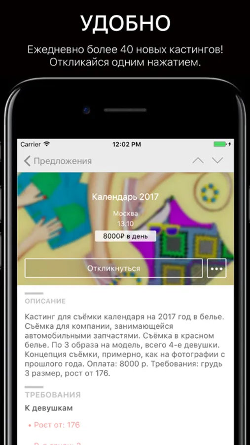 У вас есть возможность откликнуться на все самые актуальные предложения по работе в модельной сфере, не заполняя каждый раз анкету! Достаточно сделать это один раз при регистрации, далее вам будет необходимо только одним нажатием кнопки откликнуться на предложения и ваше портфолио со всей необходимой информацией будет направлено заказчику.