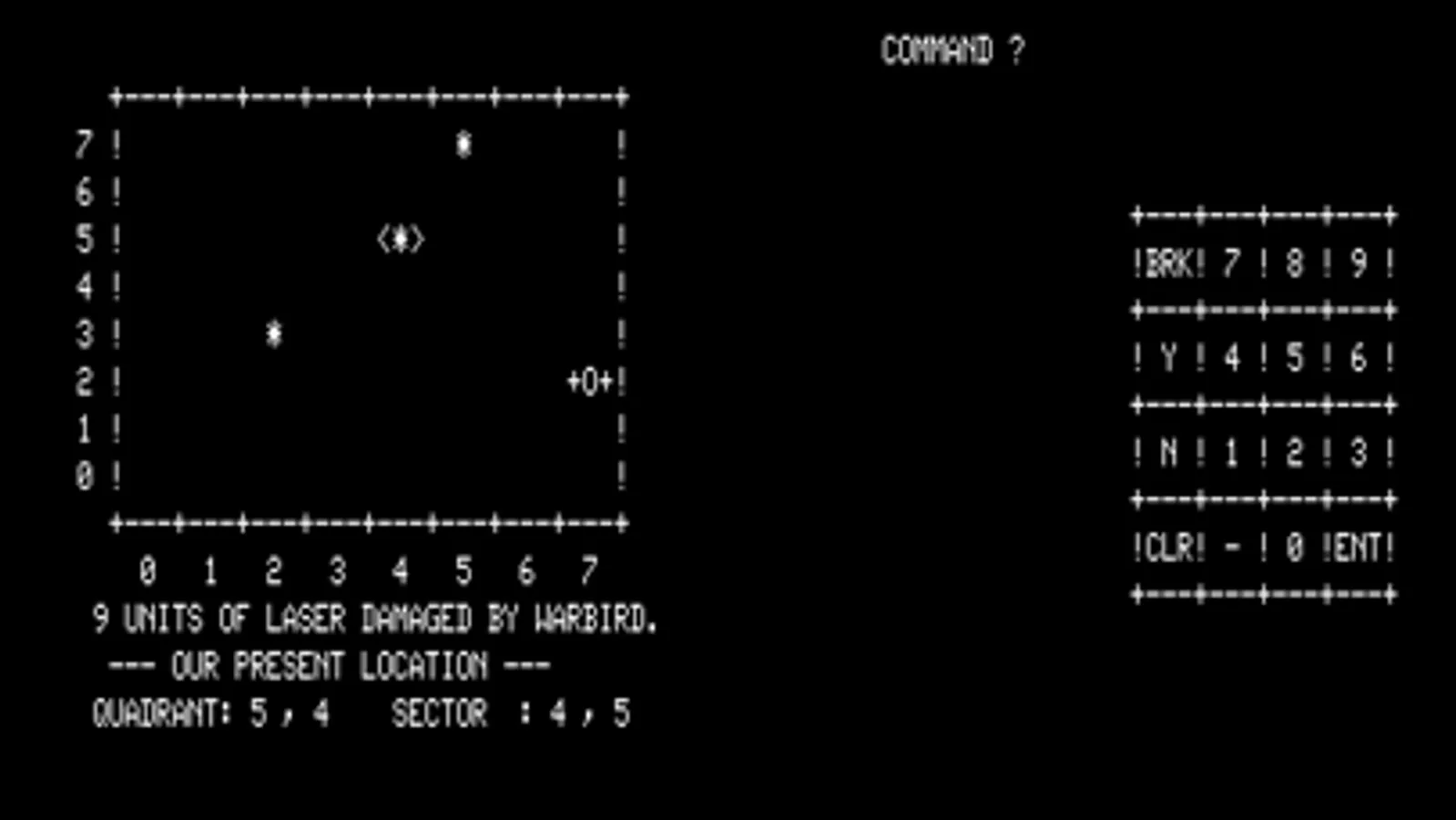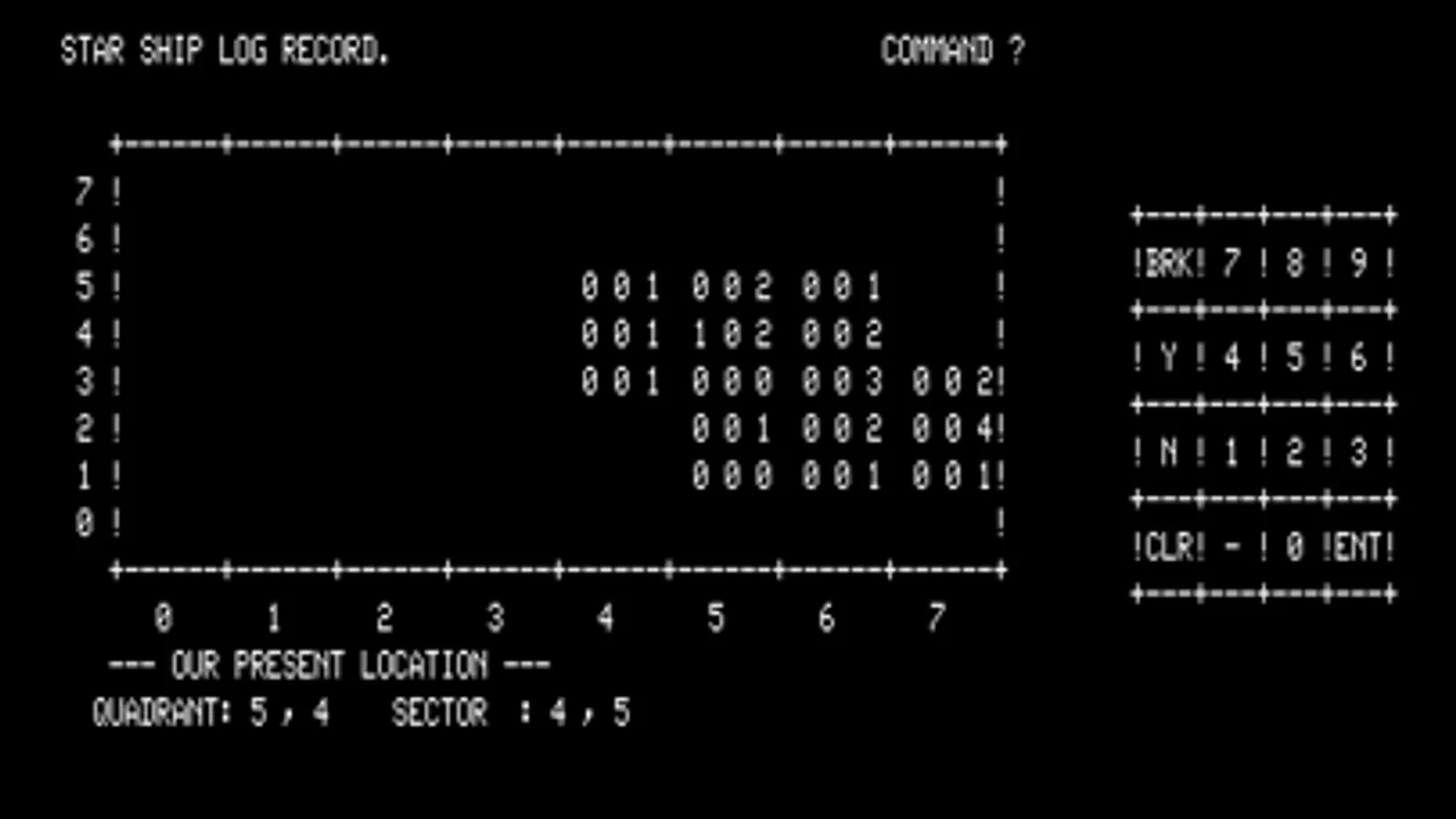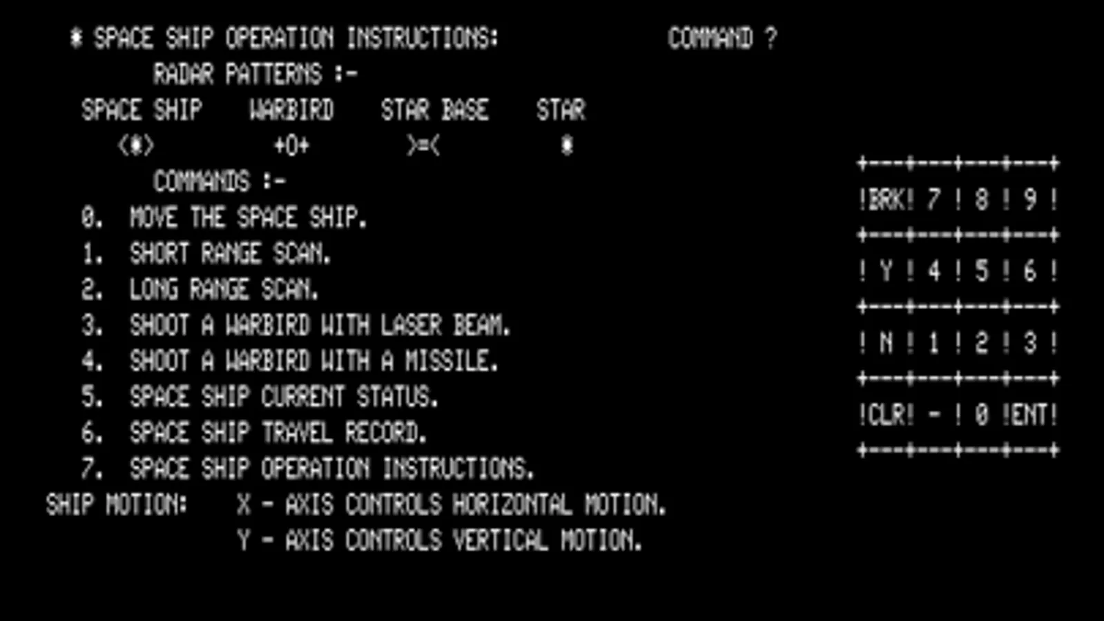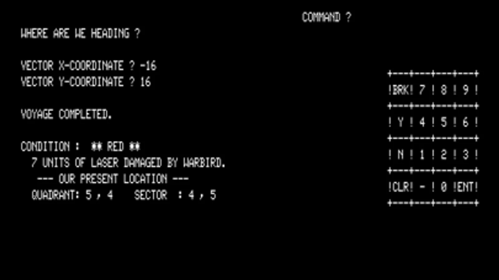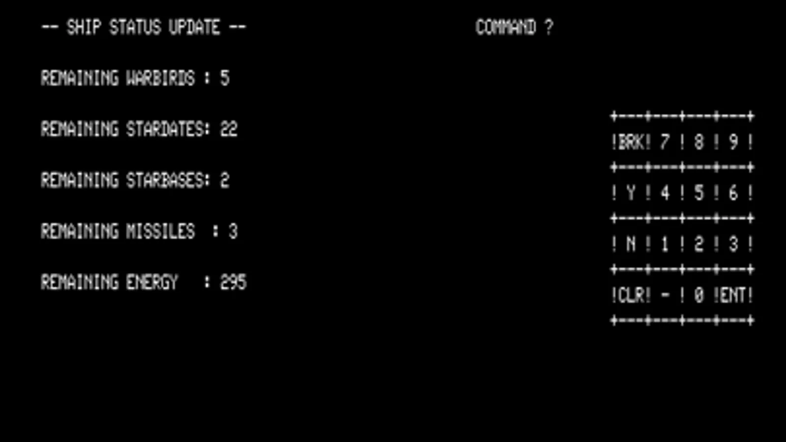 In this version you have 35 stardates to track down and eliminate 7 warbirds. You can move through the galaxy, perform short and long range scans, and then shoot using lasers or missiles. If you run low of energy or missiles you can dock with a starbase to recharge.