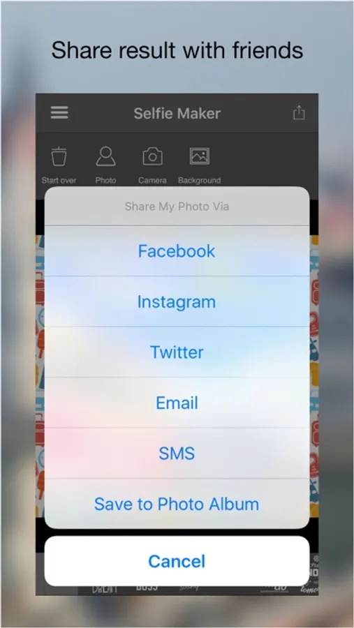 - Share the result image with your friends using Twitter, Facebook, Instagram, Email, SMS or save the result image to your Photos.
