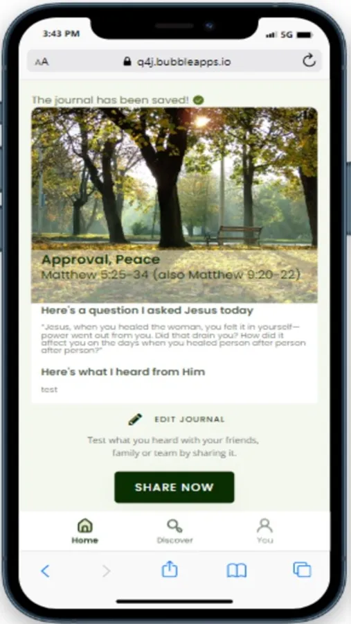 Simply read one of the 26 free meditations, choose the question you want to ask Jesus and ask away! The app helps you tune in by playing instrumental worship music as you listen, then opens the built-in journal to let you record what Jesus said. Social features make it easy to share your journey: you can quickly send journal entries by text or e-mail, or even sync up apps with a group of friends so you pray and share the same question every day!