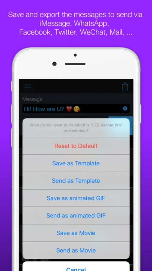 LED Banner Pro is the only banner app that can e-mail and save created LED banner animations as templates, MP4s or animated GIFs.