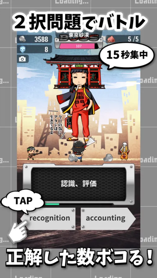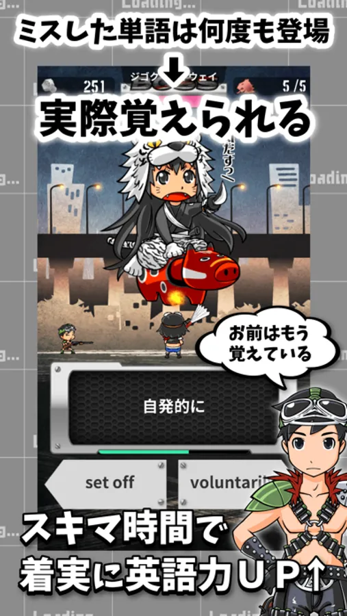 覚えるパート(ザコ戦)と答えるパート(BOSS戦)を交互に繰り返すことでTOEIC®の頻出単語をテンポよく学習することができます。