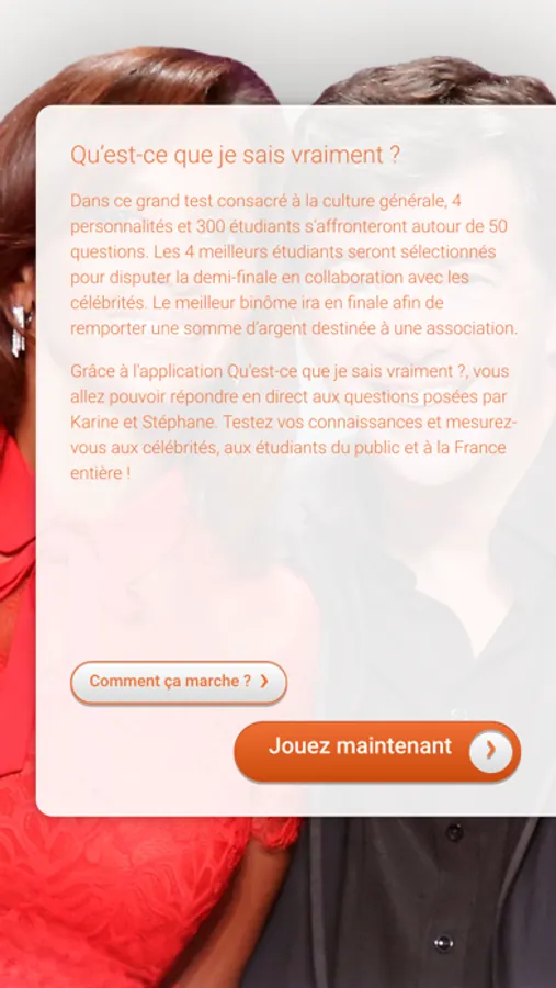 Grâce à l'application Qu'est-ce que je sais vraiment ?, vous allez pouvoir répondre en direct aux questions posées par Karine et Stéphane. Testez vos connaissances et mesurez-vous aux célébrités, aux étudiants du public et à la France entière !
