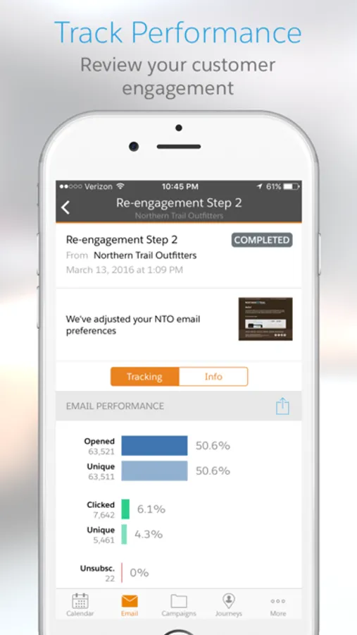 • Track performance for Email, Journey Builder, Automation Studio, and Campaigns