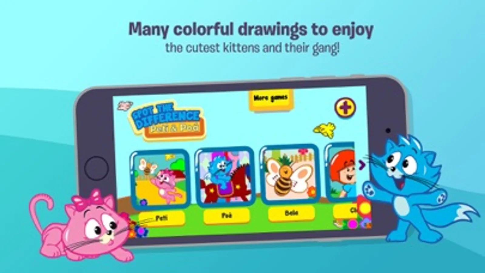 Colorful drawings to have fun with the cutest kittens and all their gang! You can also play in pairs with your friends.