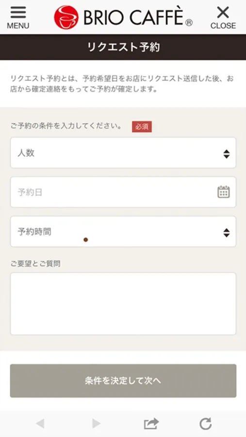 希望の人数・日時を指定して送信するだけで予約を依頼できます。