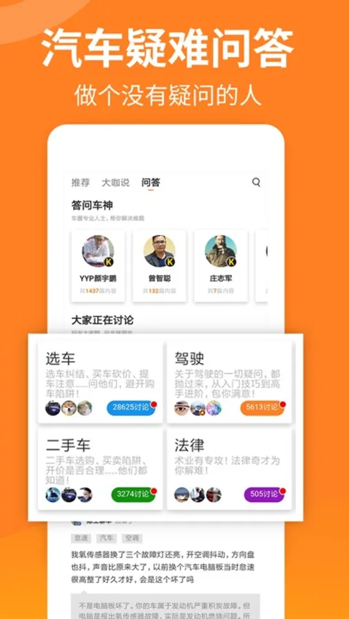 我们专为汽车圈打造的问答产品《大家车问》,是汽车领域的专业问答平台。车圈网红、汽车导购达人、维修大神、保险大咖云集于此,目前已进驻10000多名国内外汽车行业老师,其中业内顶尖专业老师1000+,让汽车大咖与每一个咖友都能亲密,一同排忧解难。