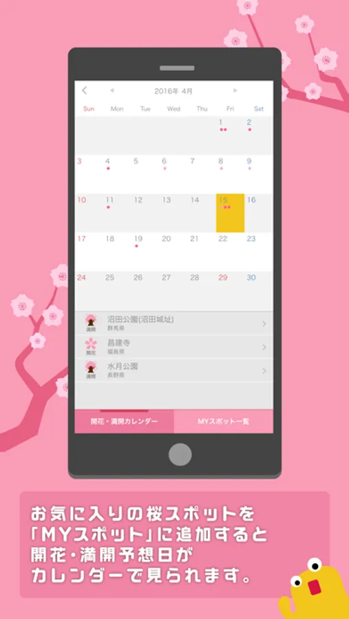 MYスポットの開花予想日、満開予想日の日付には印が入ります。