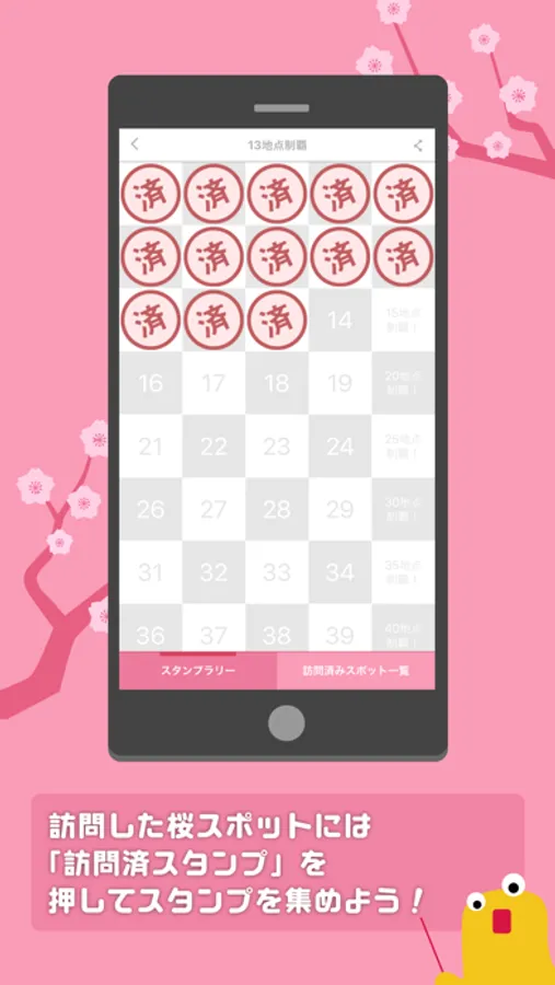 これまでに訪問済みスタンプを押したスポットを見ることができます。