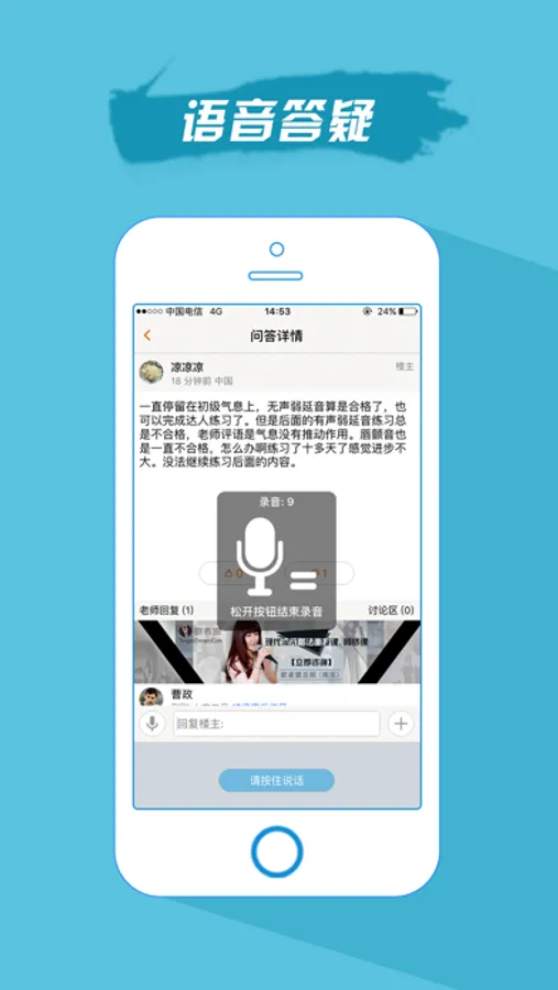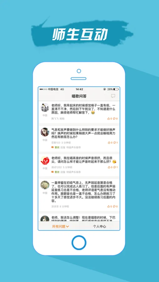 歌者盟老师版包含『演唱问答』模块,老师可以方便的用文字、语音来解答学生的唱歌问题,也可以推荐适合学习的声乐练习和训练计划供学生练习,帮助学生迅速的提高演唱水平。学生可以用文字、语音等方式向老师提问,也可以发布自己演唱的歌曲求老师点评指导。支持回复全民K歌、酷我K歌、天籁K歌等手机KTV音乐软件录制的歌曲。