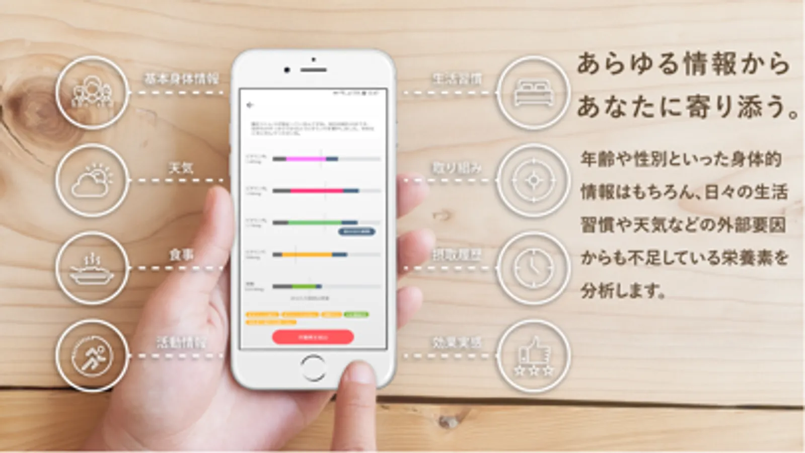 年齢、性別、生活習慣、効果実感、あらゆる情報からあなたに寄り添い、栄養素を提供いたします。