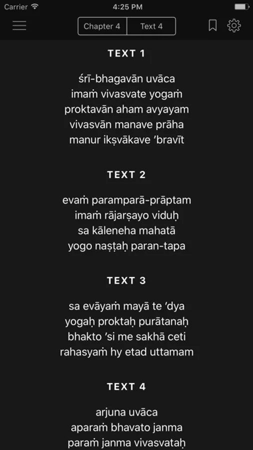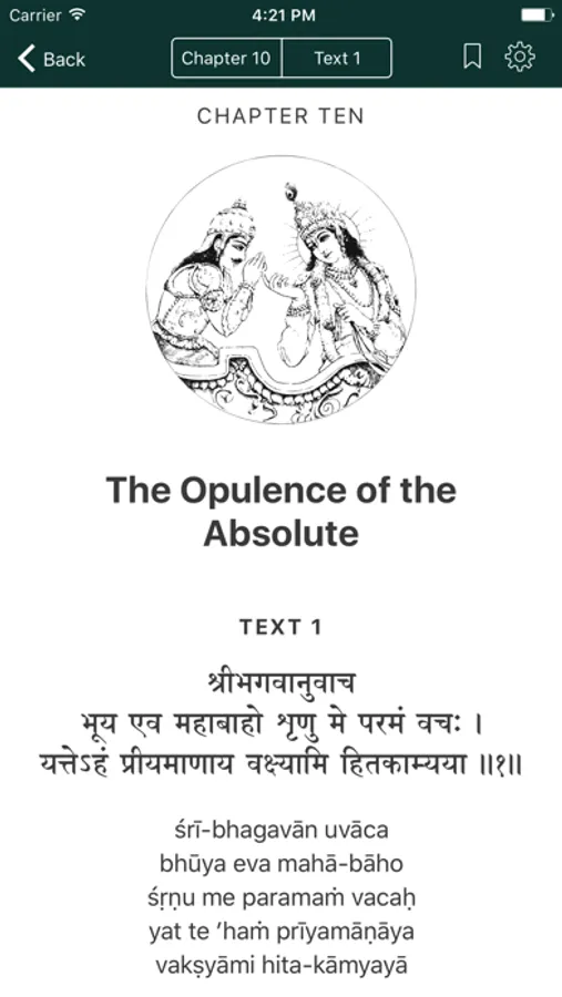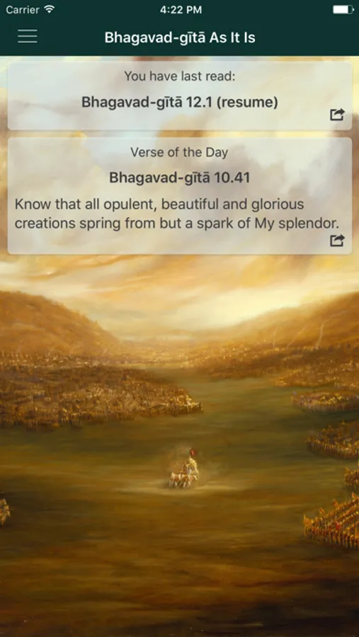 • Wake up (or go to sleep) to a Gita verse with the Verse of the Day feature on the home screen. Each app user’s daily verse is unique to his or her phone.