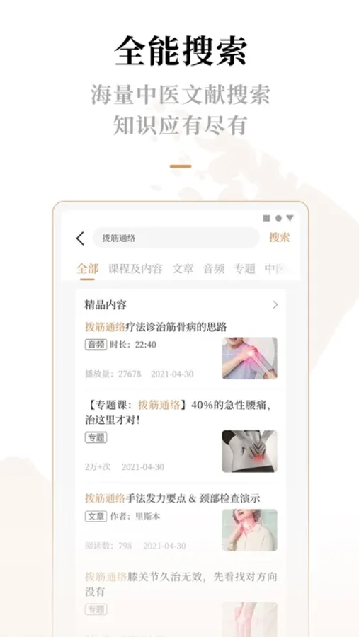 那么,现在就由我们来选文章、编专题、添声音,把曾经浪费的时间还给你。通过APP,一键搜索网尽古今明师理论,在深入的医理、丰富的医案间,帮你复盘病历提升自己。