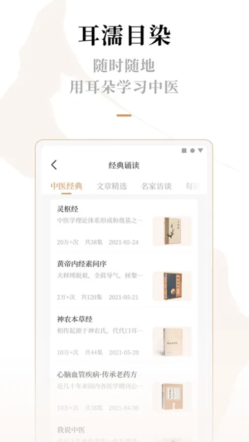 【音频随听】“经典朗诵”包含《黄帝内经》《伤寒论》等经典条文,《医宗金鉴》《汤头歌诀》等临床利器,解放眼睛,用耳朵也能随时学中医。“每周电台”精选中医文章,从临床到理论,从文字到声音,每周更新!