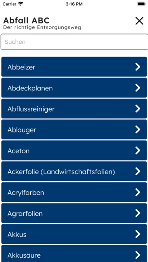 Über das Abfall ABC findet der Bürger alle gewünschten Details zur Abfall- oder Wertstoffsorte, den Entsorgungsweg oder z.B. den nächsten relevanten Standort.