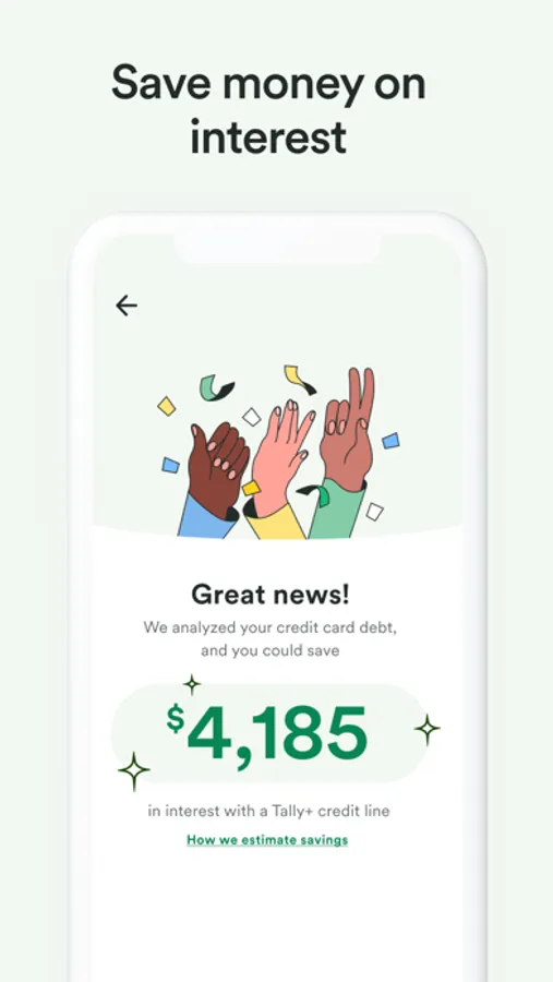 Once you qualify, Tally gives you a line of credit with a low annual percentage rate (APR). Tally then uses the new line of credit to pay your credit cards every month. The low APR helps save you money on interest. (Scroll down for important disclosures about what Tally charges.)