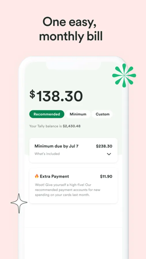 Manage all your credit cards in one simple app! Tally keeps track of the balances, interest rates and due dates for each card. That’s how Tally makes the right payment to the right card at the right time. All you have to do is make one monthly payment to Tally.