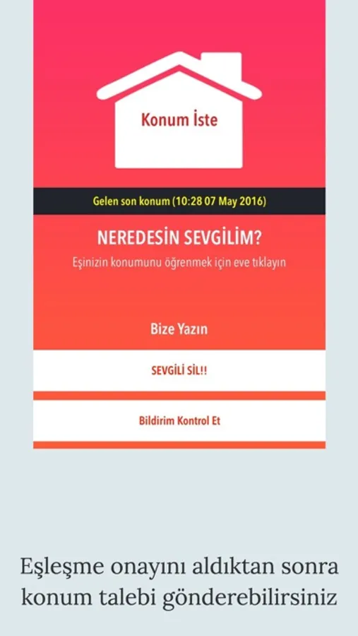 Tamamen ücretsiz olan ve sosyal ağ hesaplarınızla ilgilenmeyen uygulamamız; sadece onay kodu mantığı ile çalışıyor. Uygulamayı açtığınız zaman size verilen kodu eşinize iletin; eşleşmeyi başlatın. Arkaplanda bulunan görsel eve dönüştüğü zaman artık hazırsınız demektir. Günlük sorgu limiti olmadan, istediğiniz kadar yer bildirimi talep edebilirsiniz.