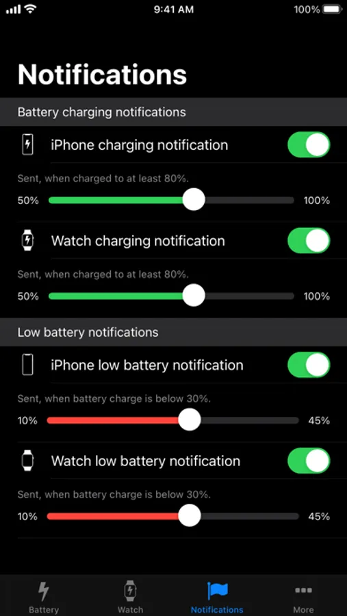 • Set up battery charging notifications to receive a message, when your Apple Watch or iPhone battery is charged to a predefined level