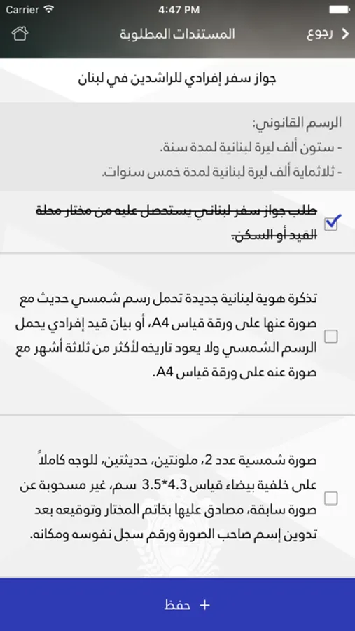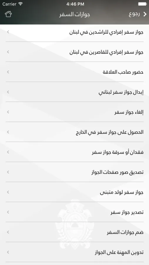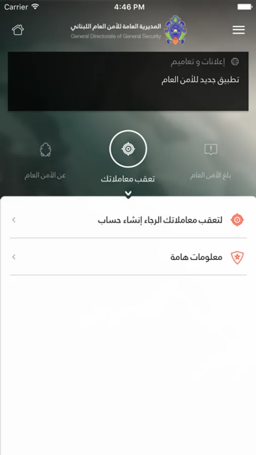 This application mainly aims at promoting e-government services in Lebanon. Specifically, one of its attractive features labeled as "track your application" is offering Lebanese citizens as well as foreigners residing in Lebanon the possibility to follow the course of some of their applications being considered by the Lebanese General Directorate of General Security (GDGS). Furthermore, it notifies applicants about the accomplishment of their applications and about the collection dates. This includes, for this first release, Lebanese passports, residency permits, visas and Palestinian travel documents.
