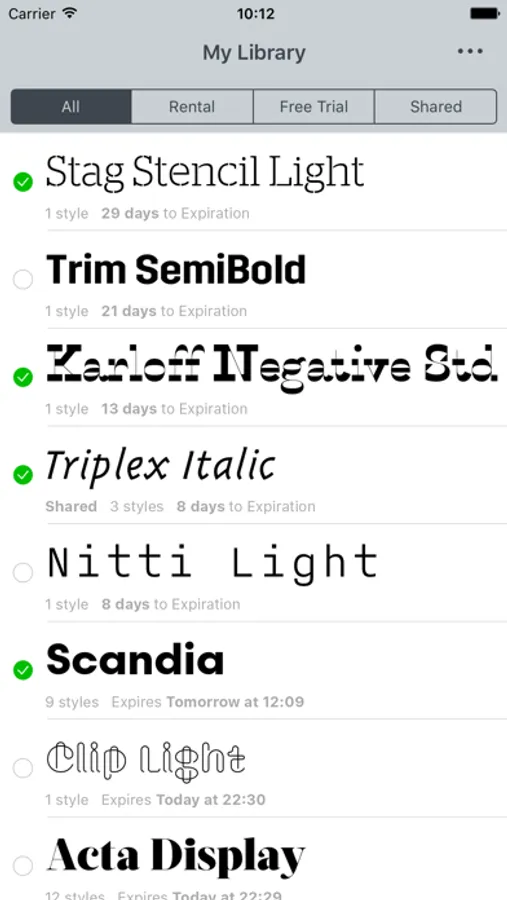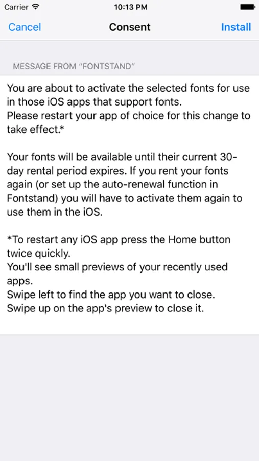Once you have activated a font trial or rental on your computer you can log in to Fontstand for iOS with your Fontstand username and password. You will be provided with a list of your active fonts. You can activate any of those for your iOS apps for no additional price. Just click on the empty circle on the left of each listed font and follow the installation process.