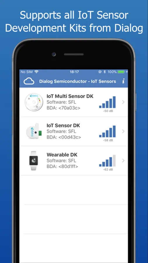 The SmartBond™ IoT Sensors app from Dialog Semiconductor is a mobile application that works with the IoT Sensor Development Kits based on Dialog’s DA14585, DA14583 and DA14681 Bluetooth® Low Energy SoCs.