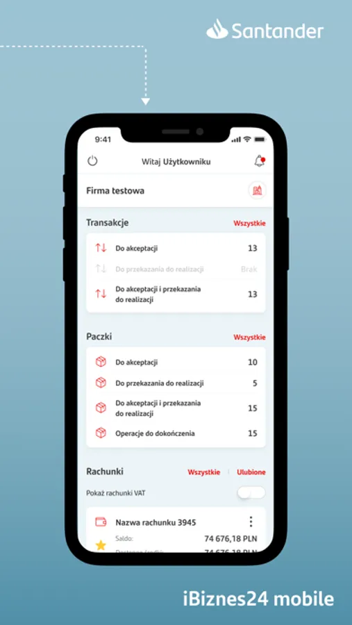 The Santander Bank Polska S.A. iBiznes24 mobile application enables easy, quick and convenient access to the iBiznes24 service. The application is dedicated to business customers who use the iBiznes24 internet. Thanks to the mobile application, persons responsible for financial management of businesses and corporations can work in any place and at any time, without the need to use the computer.