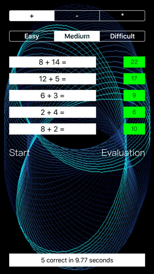 "Medium" level: for addition and subtraction the generated random numbers vary from one to fifteen, for the multiplication the numbers vary from one to ten.