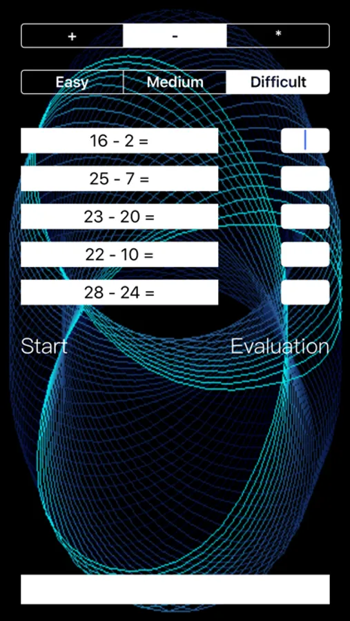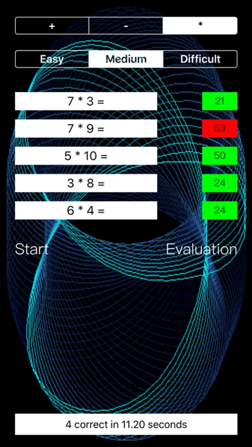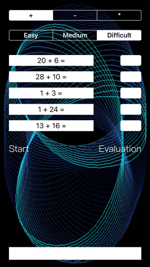 "Difficult" level: for addition and subtraction the generated random numbers vary from one to thirty, for the multiplication the numbers vary from one to fifteen.
