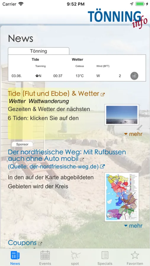 • ständig aktualisierte Informationen zu den Gezeiten (Tiden/Hoch—und Niedrigwasser), News aus der Region und Wissenswertem