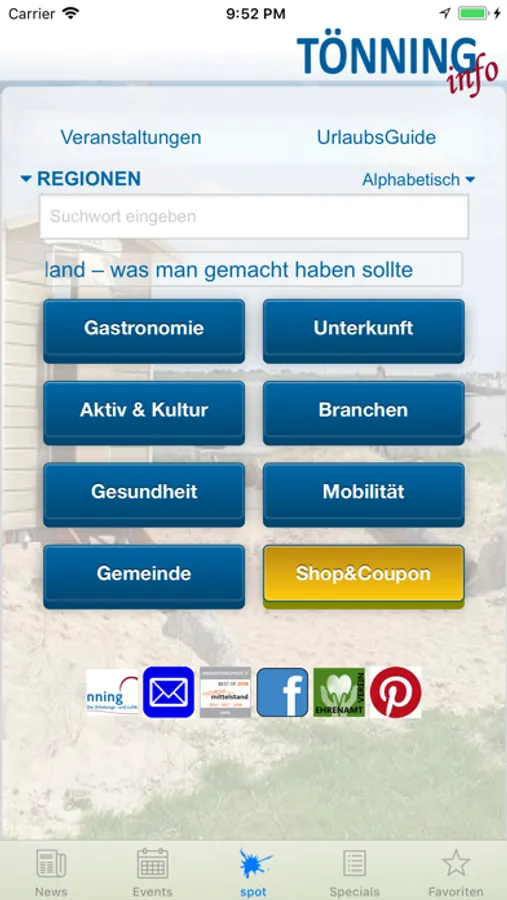 Diese kostenlose App aus und über Tönning auf Eiderstedt ist der nützliche Begleiter für die Planung, Buchung und Durchführung ihrer Reise. Mit Hilfe einer Volltextsuche, eines Kalenders oder verschiedener Suchen nach Kategorien und Merkmalen können die Informationen selektiert werden die den Bedürfnissen und Bedarfen am besten entsprechen. Die Zusammenstellung von Favoriten als Urlaubsplaner stellt die Interessen übersichtlich zusammen. Neben der alphabetischen Darstellung ist auch die Darstellung nach Entfernung oder auf einer Karte möglich. Neben einer kurzen Info zum Objekt (Restaurant, Sehenswürdigkeit, Hotel, u.v.a.m.) stehen auch alle Kontaktmöglichkeiten, Alternativen zur Suche und gegebenenfalls Bewertungen zur Verfügung.