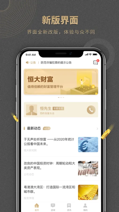 恒大金融财富管理(深圳)有限公司(简称“恒大财富”)成立于2015年,总部位于深圳,恒大财富依托恒大集团强大的品牌实力和产业背景,立足深圳,辐射全国,深入实施以财富管理为基础、基金销售为龙头、社区金融为特色的发展战略,深耕财富管理万亿蓝海。